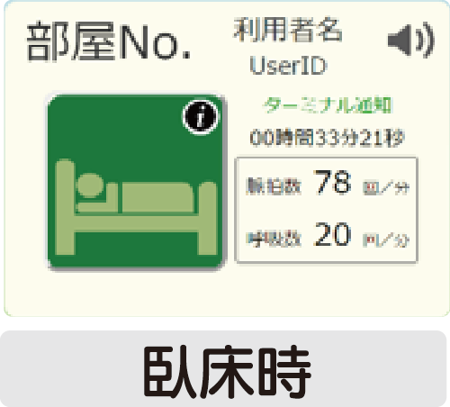 施設内のパソコン画面上に部屋毎のアイコンで現在のご利用者の状態を「色」と「体位」で表示します。異常発生時は、アイコンが画面中央にポップアップすると同時にパソコンから「アラートメロディ」で異常をお知らせします。