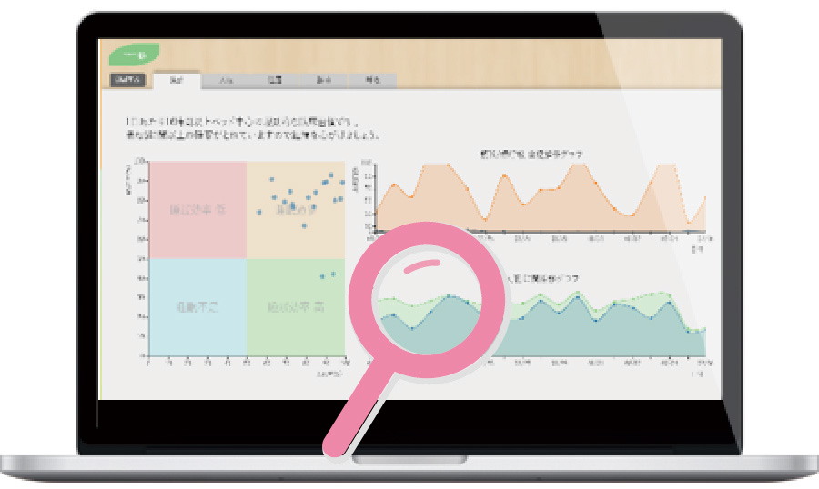 全施設のデータを集約して検証できるためパターン分析が可能です。臥床率と入眠率を1日単位で表示、入居者の睡眠の質や個性を掴む事によって、新たな気づきに繋がります。